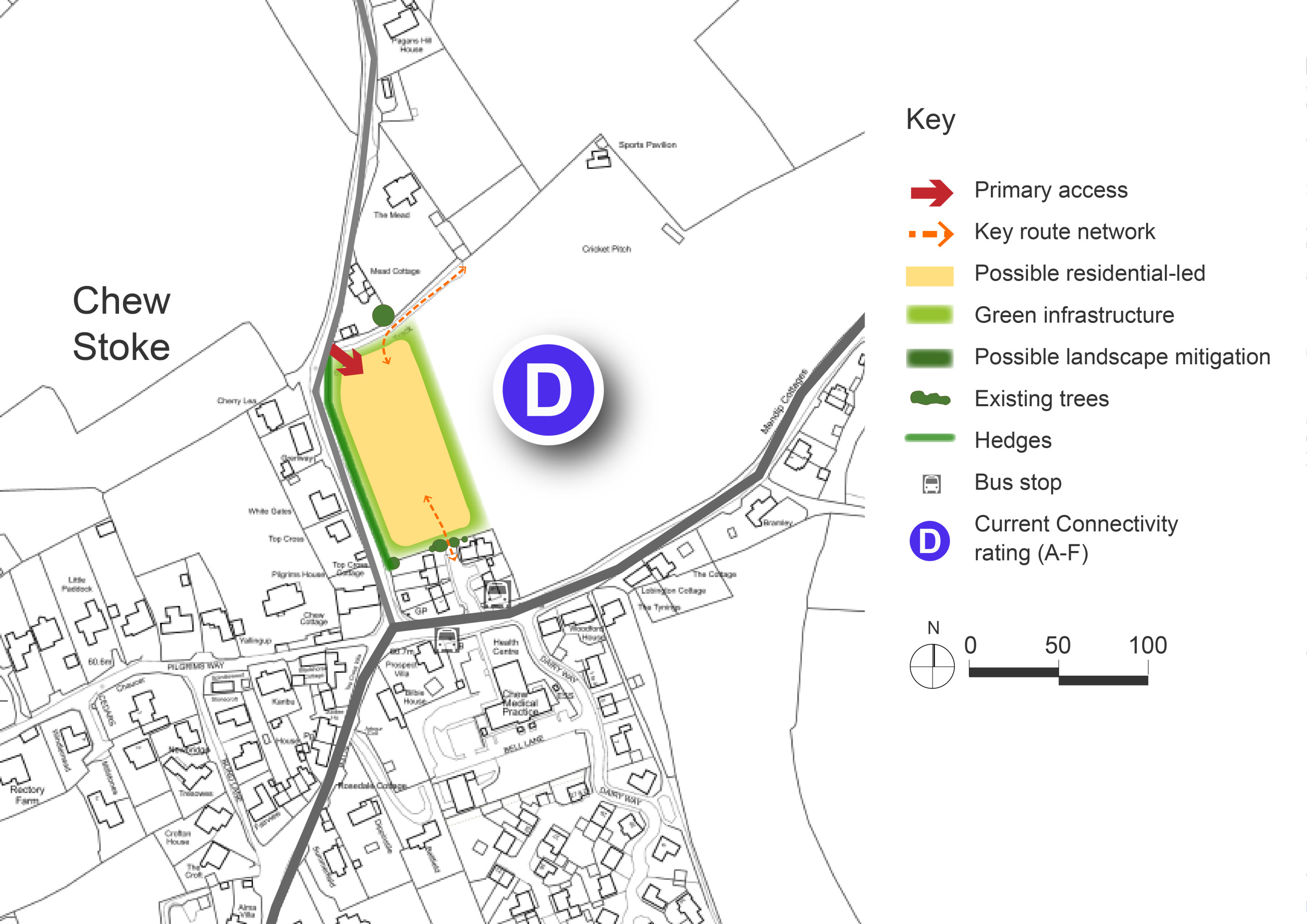 Connectivity scores shown in the site option plan below are based on the Department for Transport’s A–J grading, where A is the highest within B&NES.