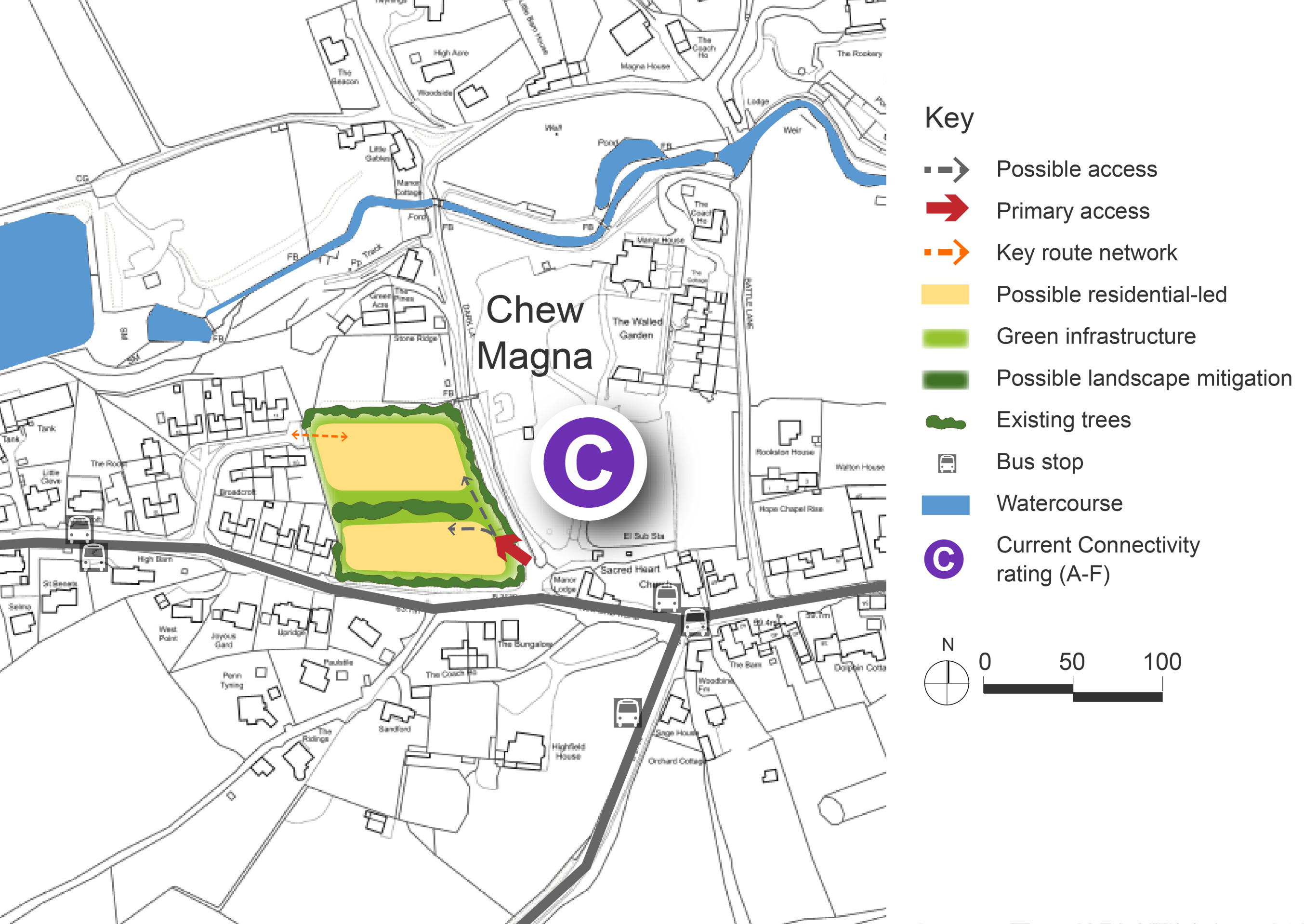 Connectivity scores shown in the site option plan below are based on the Department for Transport’s A–J grading, where A is the highest within B&NES.