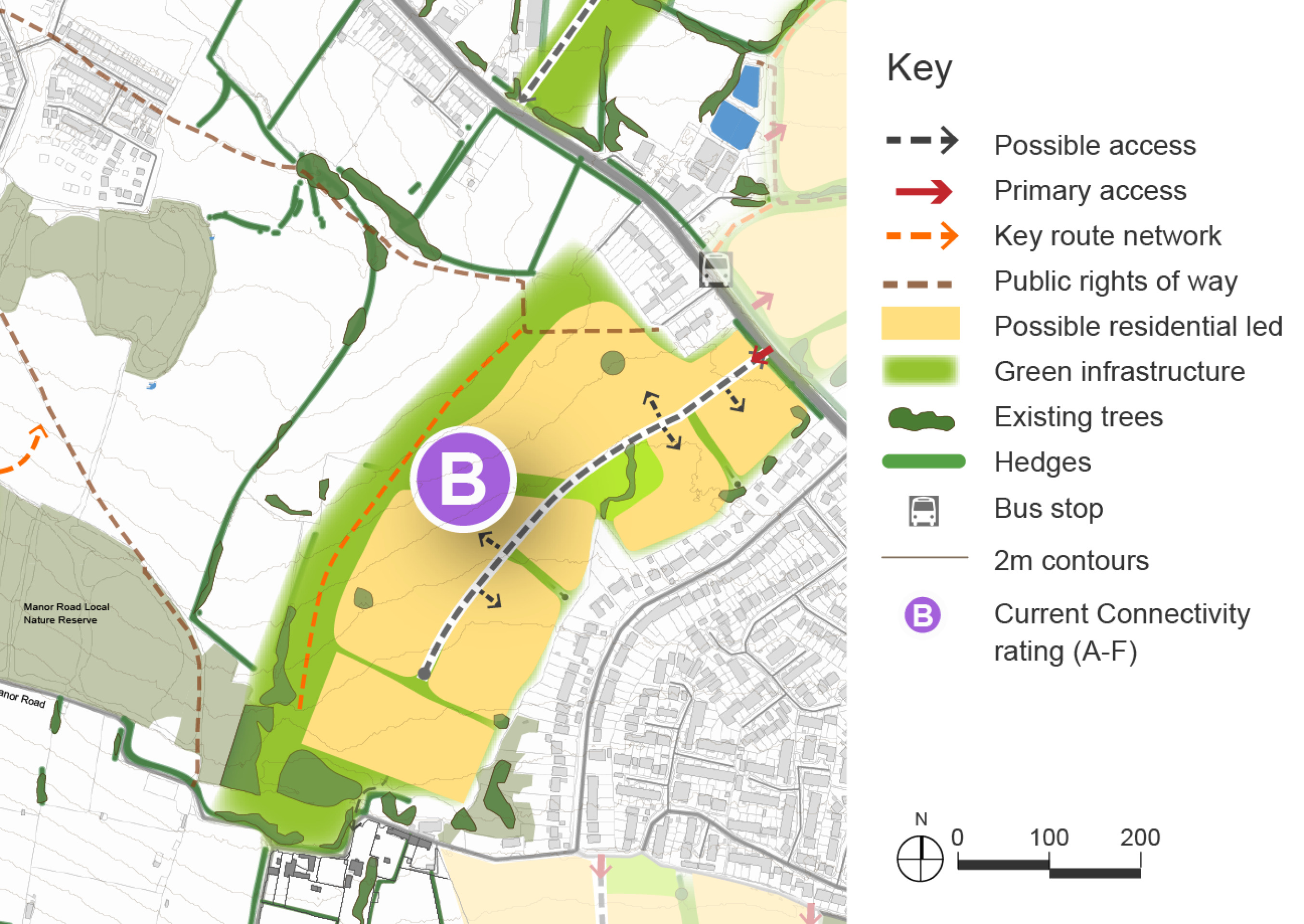 The land parcel south of the A4 is located to the west of Grange Road in Saltford Village. However, no permeability currently exists between Grange Road and the parcels, due to the continuous configuration of dwelling plots along the road. As such, walking and cycling routes into the village would need to be provided from the south side of the site, connecting to Manor Road, and to the north along the A4, though there may be scope, through discussions with local landowners, to provide a walking route through an existing.