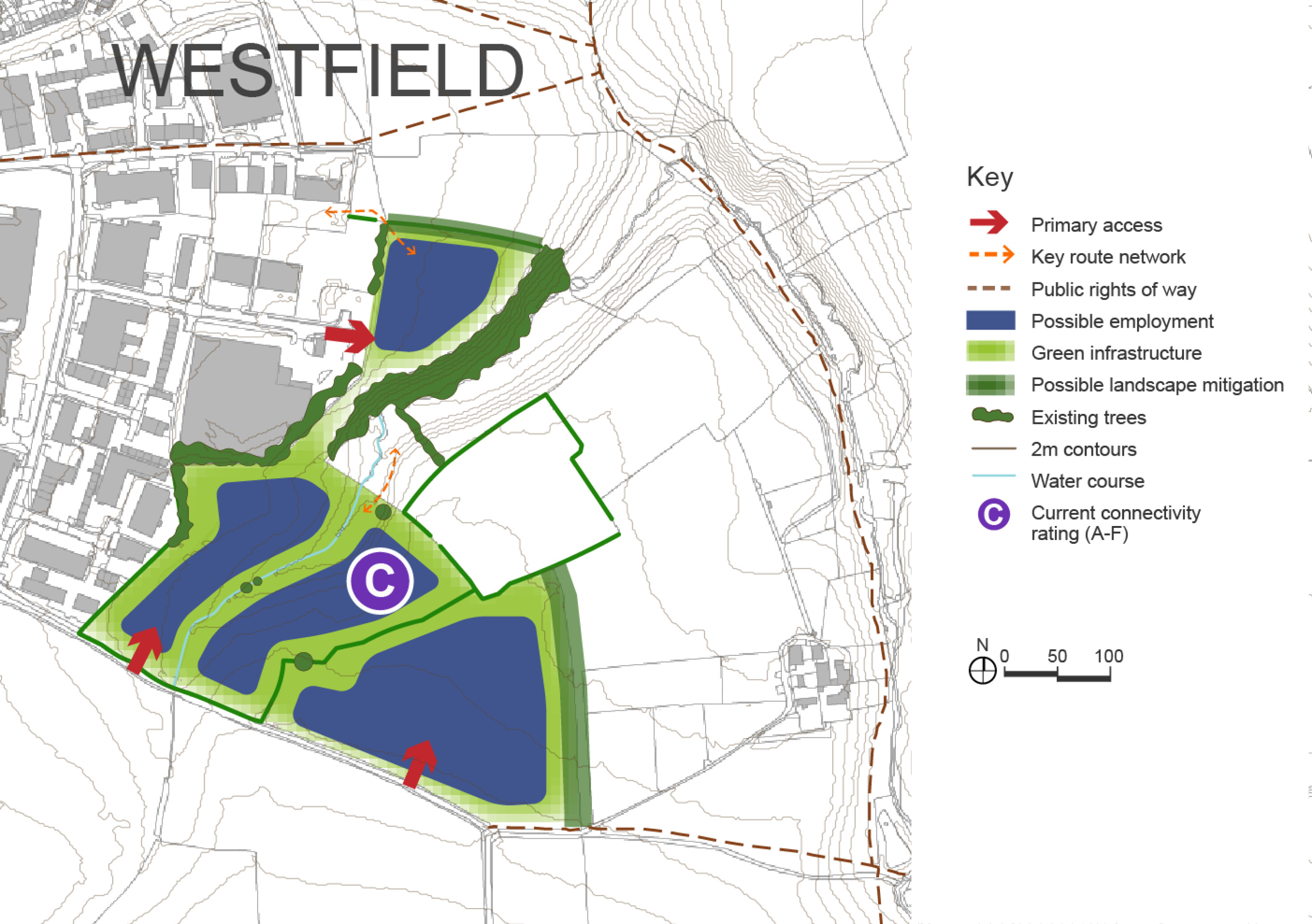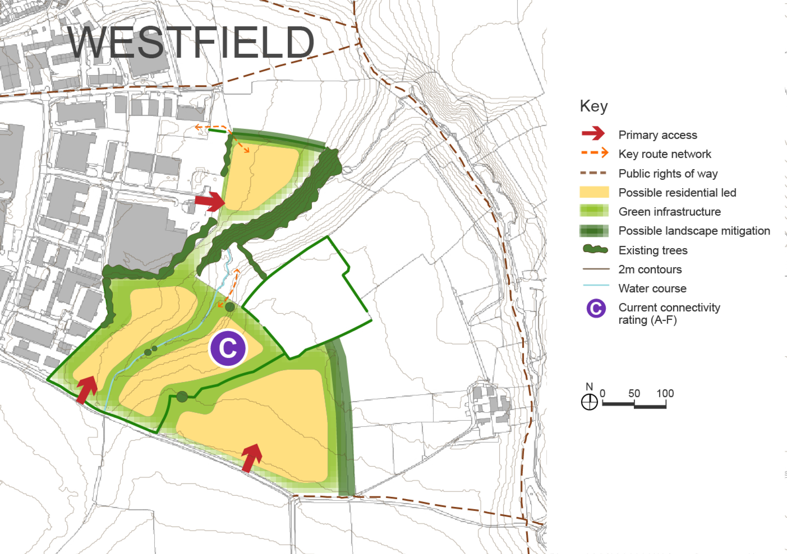Within the previous consultation the site was also considered as a housing site. It sits adjacent to the existing Westfield industrial estate. There is currently no pavement access to the main road and the site accommodates an existing stream that flows into the waterside valley. The land could accommodate around 200 homes.