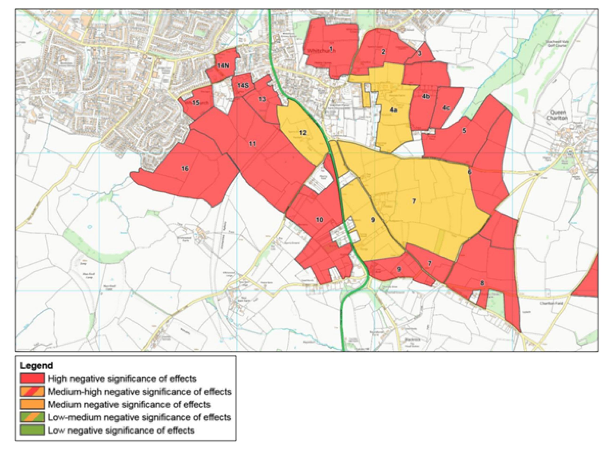 The area surrounding Whitchurch Village is also highly sensitive in terms of landscape impact. A Landscape and Visual Impact Assessment was carried out in 2017, which assessed the significance of effects of development on landscape and views for land parcels surrounding the village. The summary results of the assessment are shown on the diagram below. All of the site options for Whitchurch Village include development of parcels rated as having a high or medium-high negative significance of effects. These are noted in the constraints for each site, and if any allocations are proposed in Whitchurch Village at Draft Local Plan stage, these will need to be informed by additional landscape sensitivity work, and consideration of potential mitigation.