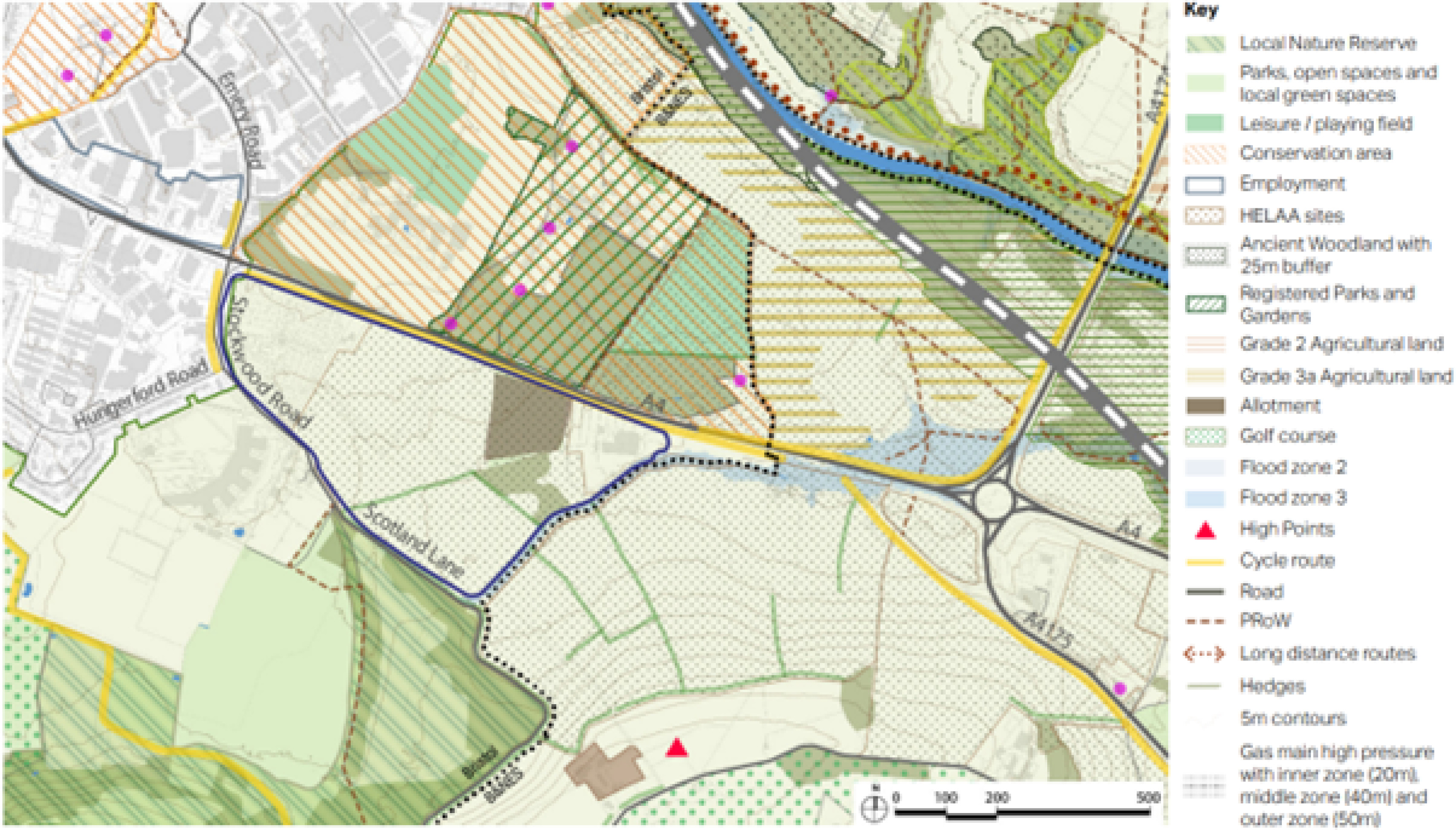 Whilst there are many footpaths south of the Hicks Gate site there are no footpaths in the Hicks Gate site allocation, reducing connectivity within and through the area. The A4 severs movement across the area and cycling is restricted along this busy route. Cycle routes could be relocated away from the A4 to provide active travel links and improve the air quality.