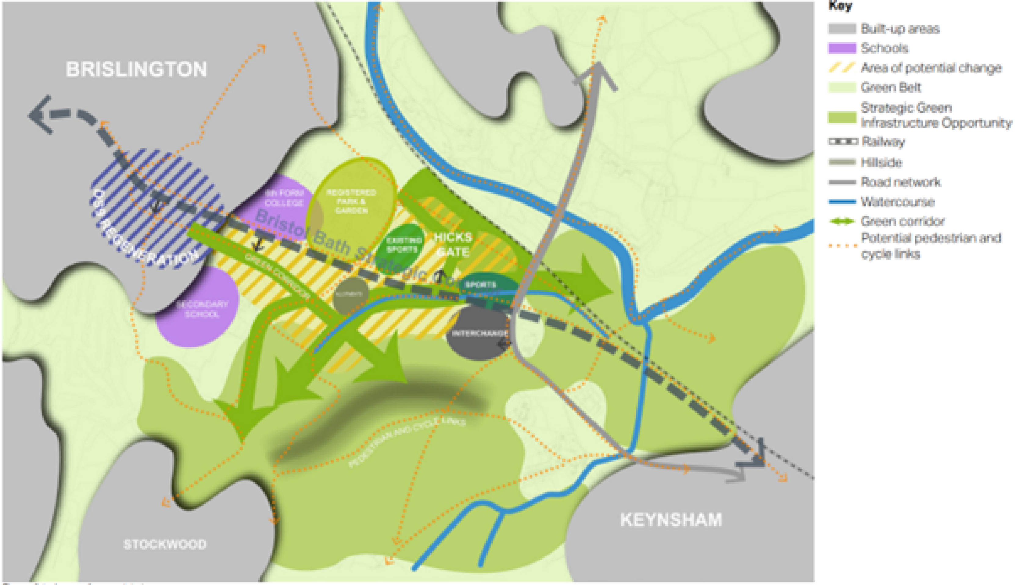 The emerging strategy set out below relates to the wider Bristol to Bath corridor, incorporating the Hicks Gate area and other places. The strategy has been set out for this wider area because of the close functional and physical relationships between different places, that is they do not sit in isolation from nearby places.