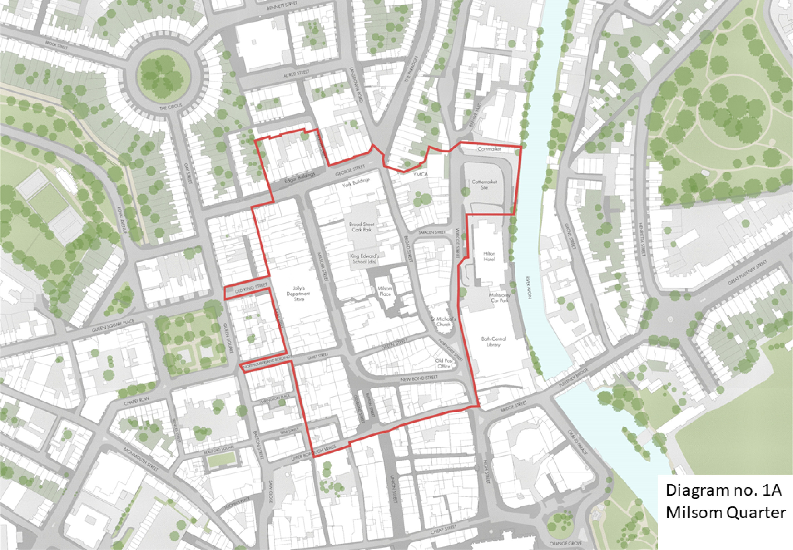 It includes the Cattlemarket Site, which is an existing site allocation (SB1) that was recently updated as part of the Local Plan Partial Update (LPPU). The Milsom Quarter Masterplan also has an aspiration to introduce approximately 180 new homes through new build or through the repurposing of upper floors that are currently vacant.