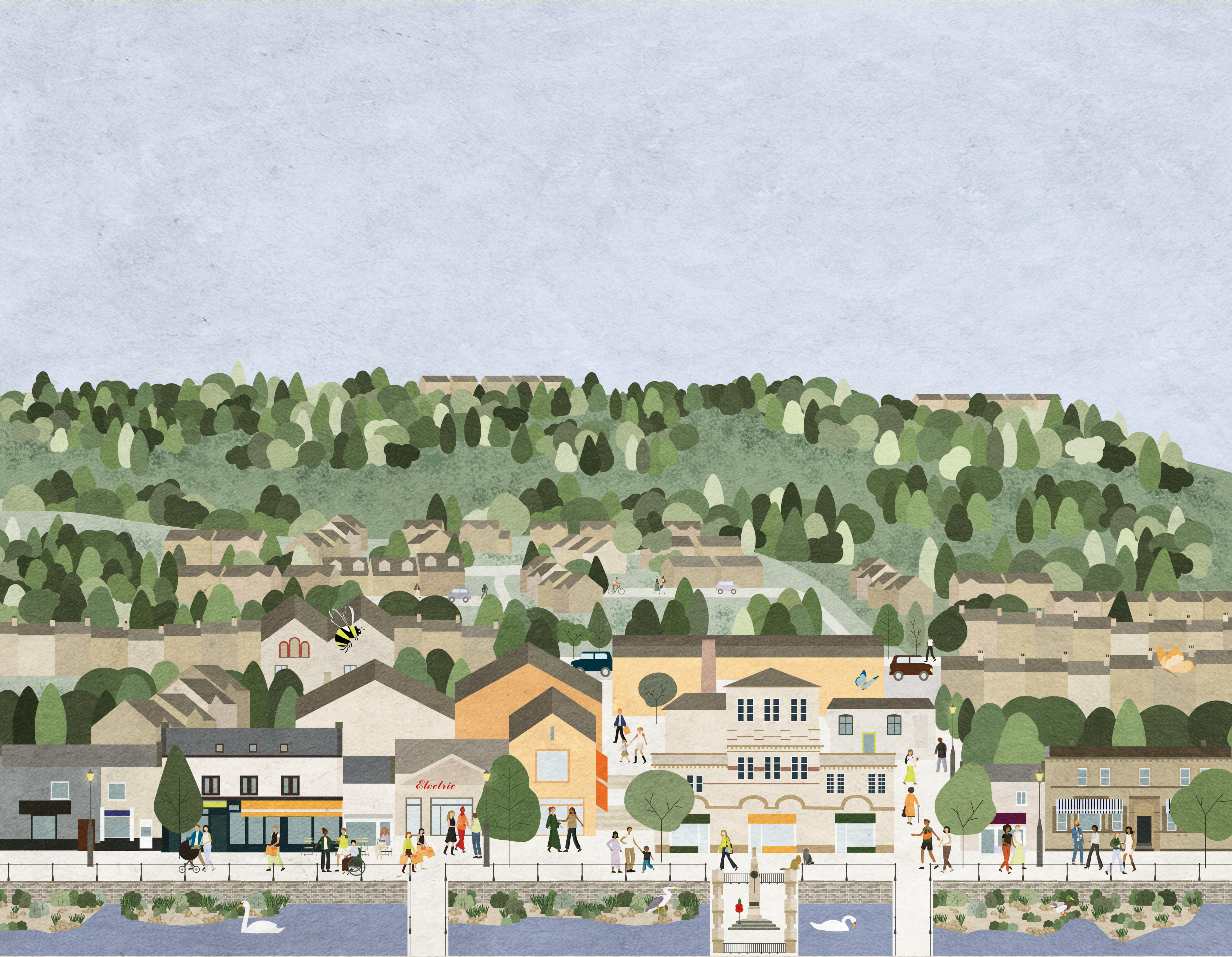 The River Somer will remain a special asset for the high street, acting as an important, wildlife-rich habitat that improves community well-being, biodiversity and urban cooling. Connections to Midsomer Norton Town Park, and other local natural spaces will be improved, and public spaces on the high street will be further enhanced and greened to give visitors more opportunities to enjoy nature on their doorstep, whilst also adapting to our changing climate and allowing wildlife to thrive.