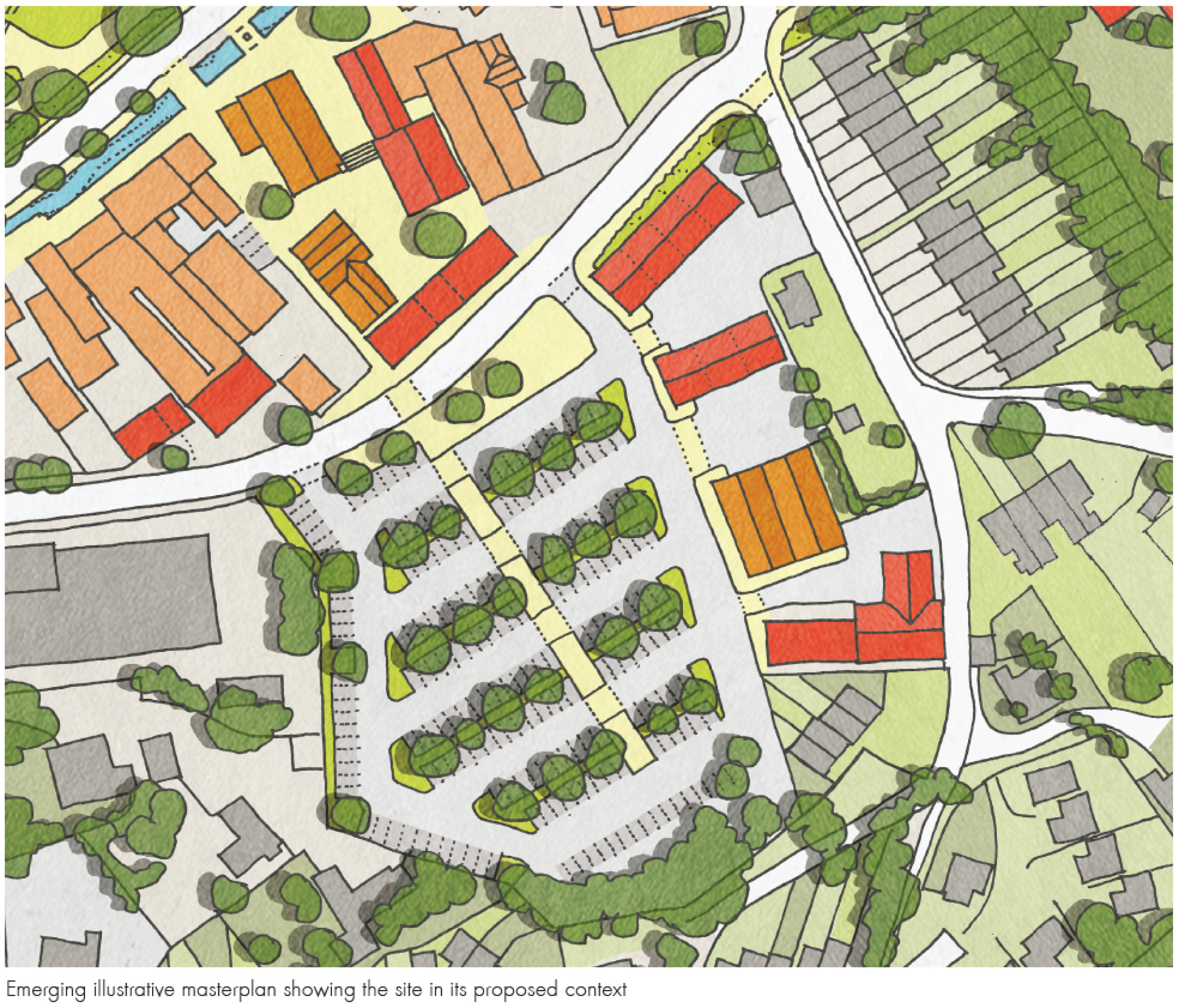 The lower part of the site is formed by an area which was previously car park. This is raised up above the road and so doesn’t present the opportunity for street level entrances. However, the buildings can overlook the street with windows, and the appearance of the northernmost elevation on to South Road needs to be considered.