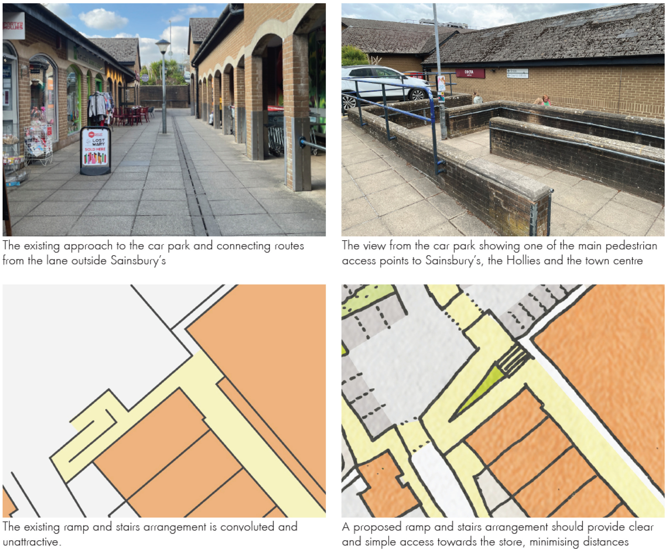 A particular element of the pedestrian provision is the arrangement of ramps and stairs at the end of the lane outside Sainsbury’s. This represent a key opportunity for improved legibility and access.