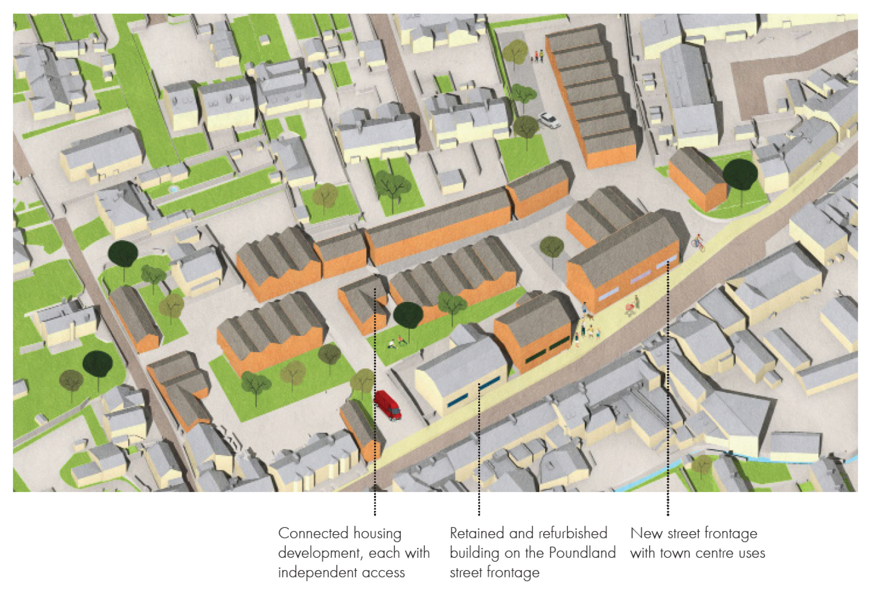 Establish new High Street frontage with active town centre uses on the Lidl and Poundland sites including the option to explore a range of building scales.